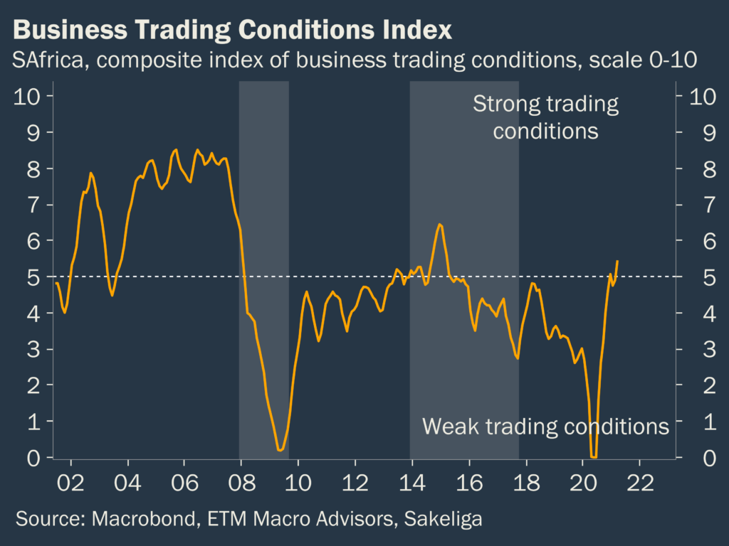 “South Africa is currently experiencing an economic recovery from the severe restrictions seen in 2020. The strong rand, commodity upswing, and global demand is benefitting some sectors, and businesses should not be overly cautious to exploit near-term opportunities”, explains Russell Lamberti, head of ETM Macro advisors.